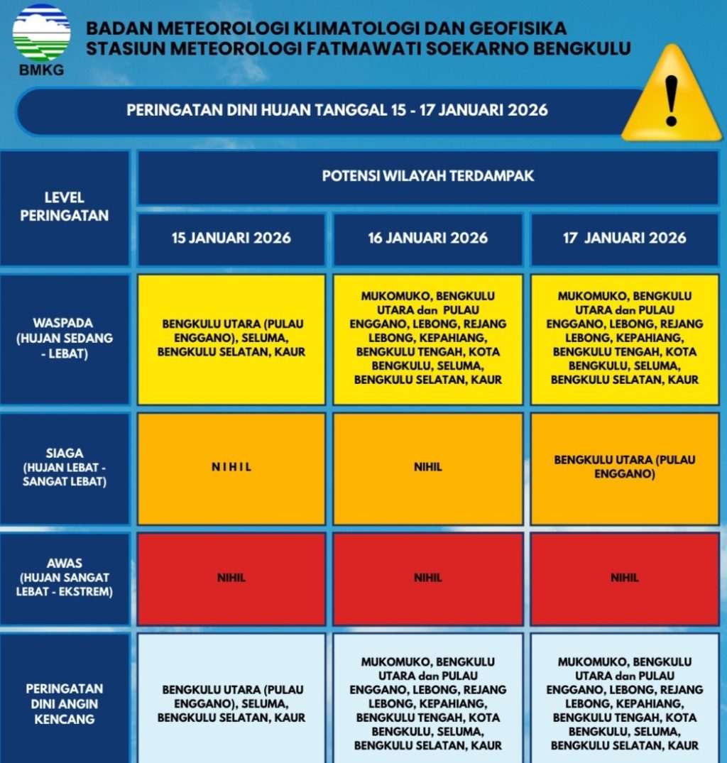 Bahkan, untuk wilayah Bengkulu Utara, khususnya Pulau Enggano, statusnya meningkat menjadi Siaga pada 17 Januari 2026 karena potensi hujan sangat lebat.