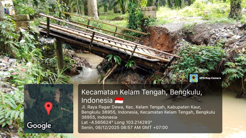 Kelam Tengah, BT.M – Bencana alam kembali melanda wilayah Kaur. Jembatan sentra pertanian Air Seranjangan Kecil di Kelam Tengah, yang merupakan akses vital bagi sedikitnya lima desa, dilaporkan putus total akibat luapan arus sungai yang deras. Peristiwa ini diperkirakan terjadi pada Minggu sore (7/12/2025) sekitar pukul 17.00 WIB.
