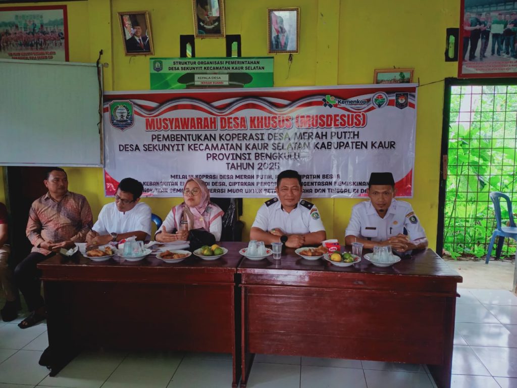 KAUR, || BT.M — Dalam upaya meningkatkan kesejahteraan masyarakat dan memberdayakan ekonomi lokal, Desa Sekunyit, Kecamatan Kaur Selatan Kabupaten Kaur, menggelar Musyawarah Desa Khusus (Musdesus) untuk pembentukan Koperasi Desa Merah Putih (Kopdes-MP). Kegiatan ini berlangsung di Balai Desa setempat pada pukul 20.00 WIB sampai dengan selesai pada Kamis malam (15-05-2025).