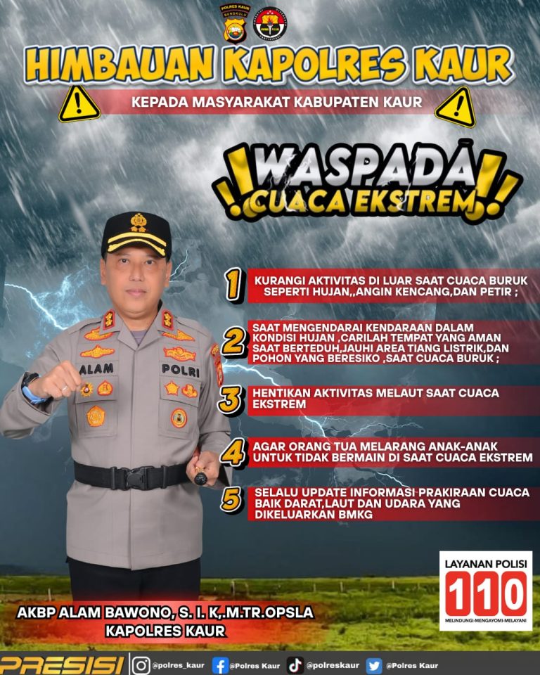 KAUR, KONTAK PUBLIK.COM – Kapolres Kaur, AKBP Alam Bawono, S.I.K., M.Tr. Opsla, mengimbau seluruh masyarakat Kabupaten Kaur untuk meningkatkan kewaspadaan...