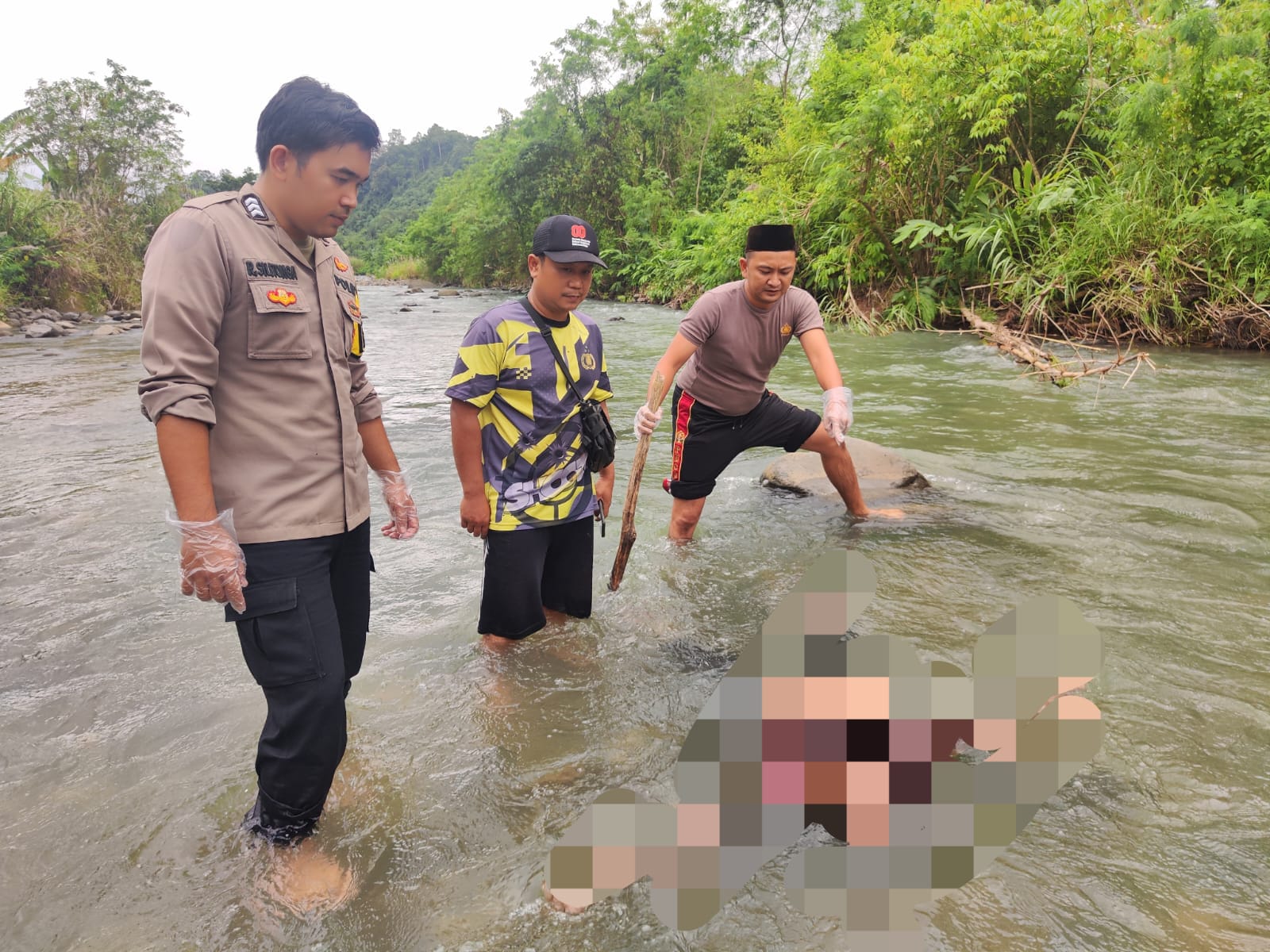 “Saksi terkejut melihat sosok tubuh manusia tersangkut di batu besar di tengah aliran sungai. Mereka langsung melaporkan temuan tersebut ke pihak kami,” ujar Ipda Suharno.