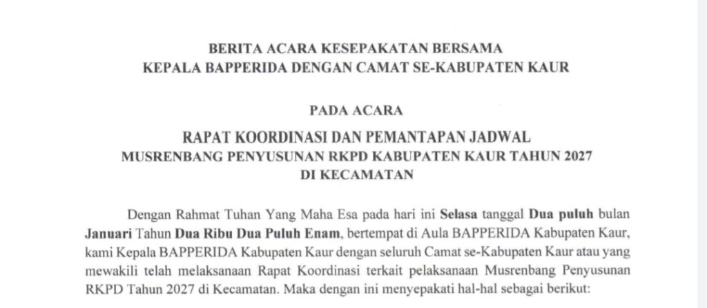 KAUR, BT.M – Langkah strategis pembangunan Kabupaten Kaur untuk tahun 2027 resmi dimulai. Badan Perencanaan Pembangunan Riset dan Inovasi Daerah (Bapperida) Kabupaten Kaur bersama seluruh Camat se-Kabupaten Kaur melakukan penandatanganan berita acara kesepakatan bersama terkait jadwal pelaksanaan Musyawarah Perencanaan Pembangunan (Musrenbang) tingkat kecamatan.