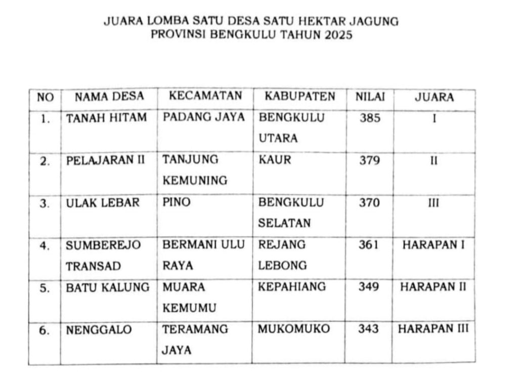 “Semoga ini menjadi motivasi bagi desa lain untuk berperan aktif mendukung program ketahanan pangan nasional, khususnya di sektor pertanian jagung. Kita buktikan bahwa Kaur mampu bersaing di tingkat provinsi,” pungkasnya.