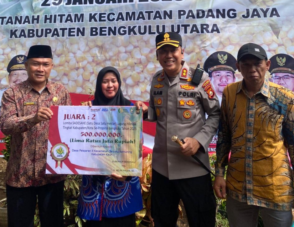 Penghargaan bergengsi tersebut diserahkan langsung dalam seremoni yang dirangkaikan dengan Panen Raya Jagung di Desa Tanah Hitam, Kabupaten Bengkulu Utara, Kamis (29/1/2026). Hadir dalam momen tersebut Gubernur Bengkulu, Kapolda Bengkulu, unsur Forkopimda, serta Kapolres Kaur, AKBP Alam Bawono, S.I.K., M.Tr.Opsla.
