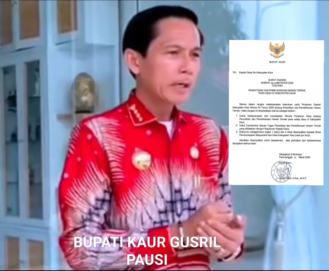 KAUR, BT.M – Pemerintah Kabupaten Kaur resmi memulai langkah tegas dalam menertibkan hewan ternak yang kerap berkeliaran bebas. Bupati Kaur, Gusril Pausi, MA.P., mengeluarkan Surat Edaran (SE) Nomor: 100-34/940/TAHUN 2026 yang menginstruksikan seluruh Kepala Desa di Kabupaten Kaur untuk memperketat pengawasan hewan ternak di wilayah masing-masing.